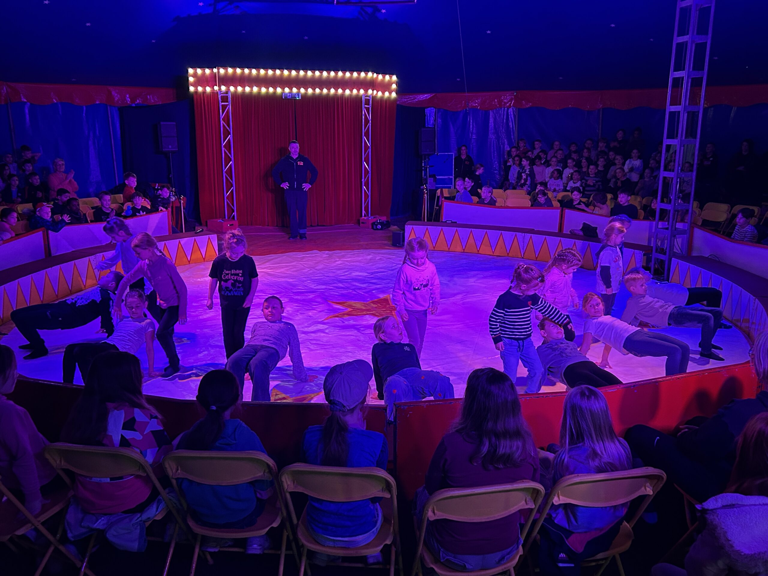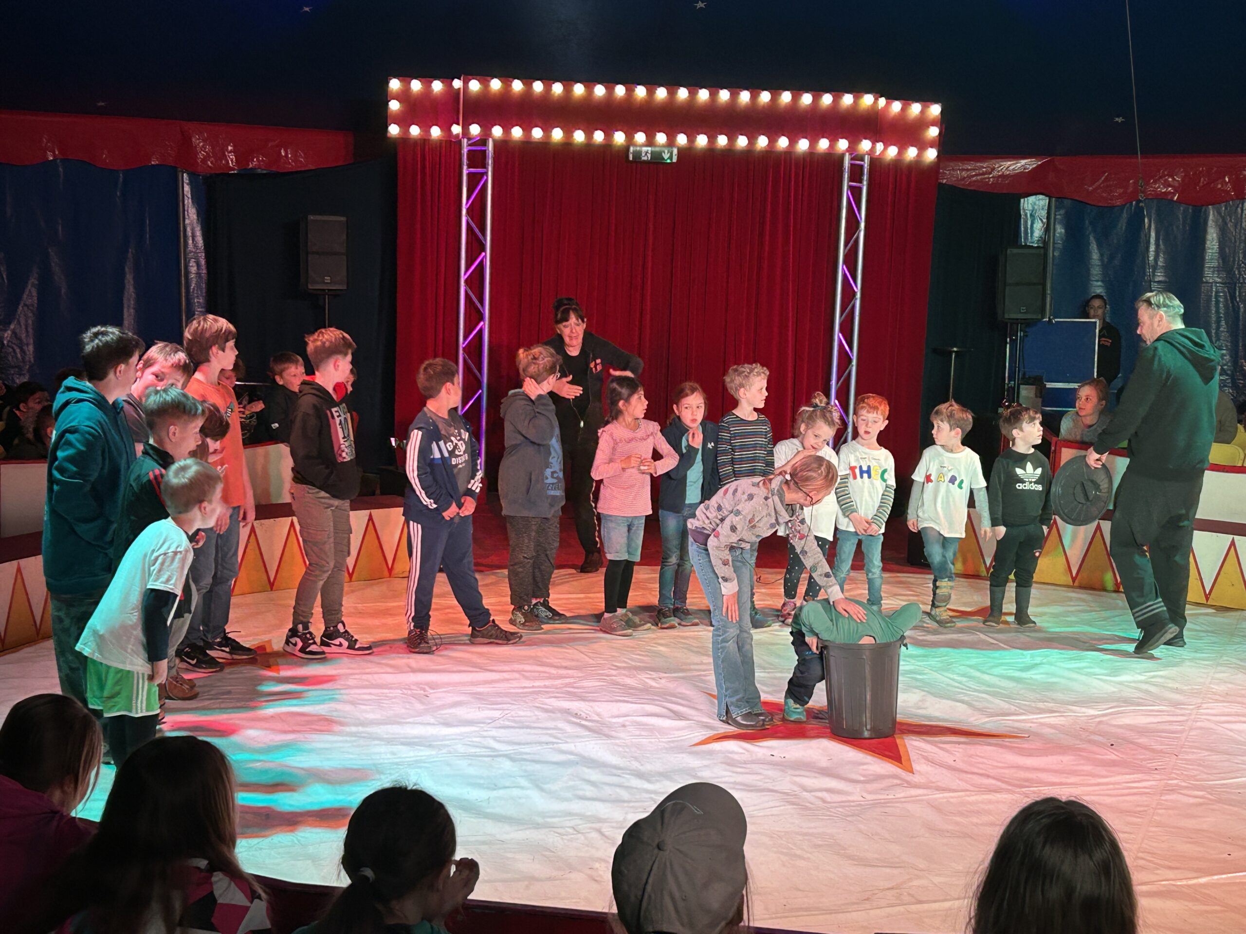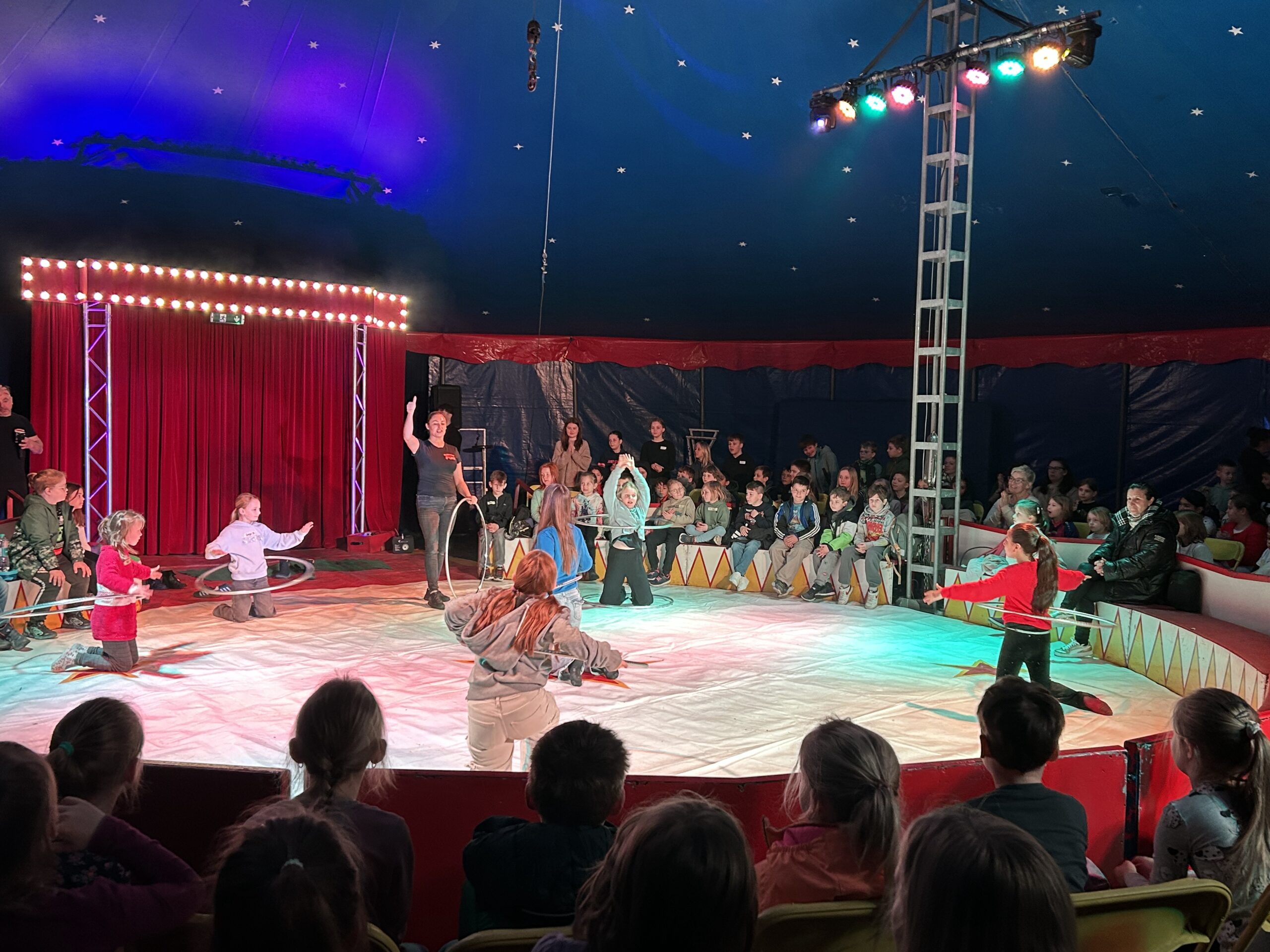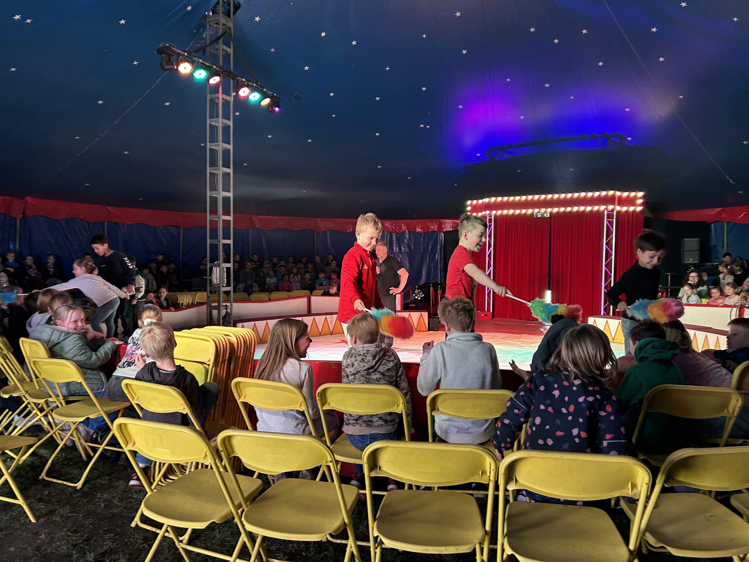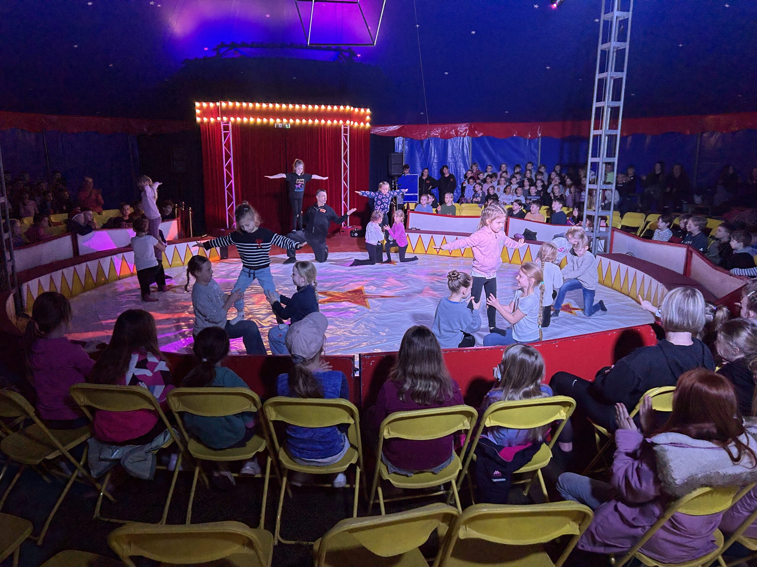 Am Montag sind wir mit allen Kindern der Grundschule und mit den Vorschulkindern aus den Kindertagesstätten in das Zirkuszelt gegangen. Dort begrüßte uns das Zirkusteam und stellte uns die Darbietungen vor. Bereits bei der Schnupperstunde konnten schon die ersten Kinder aktiv dabei sein.