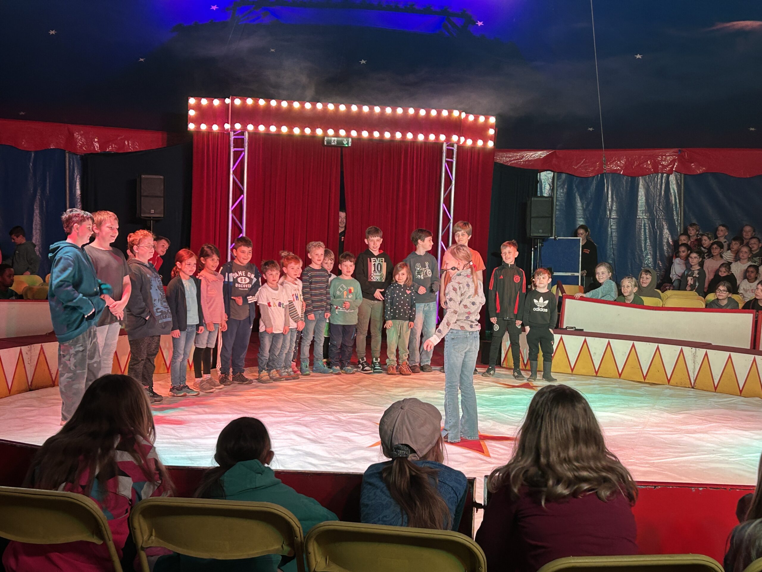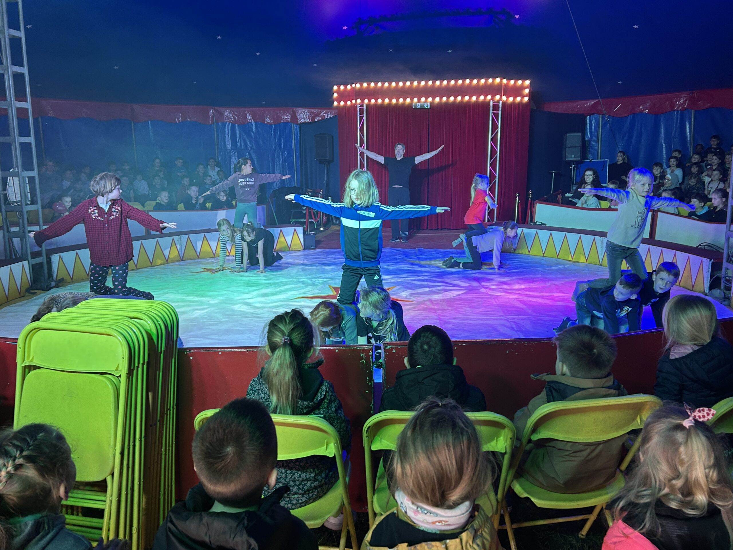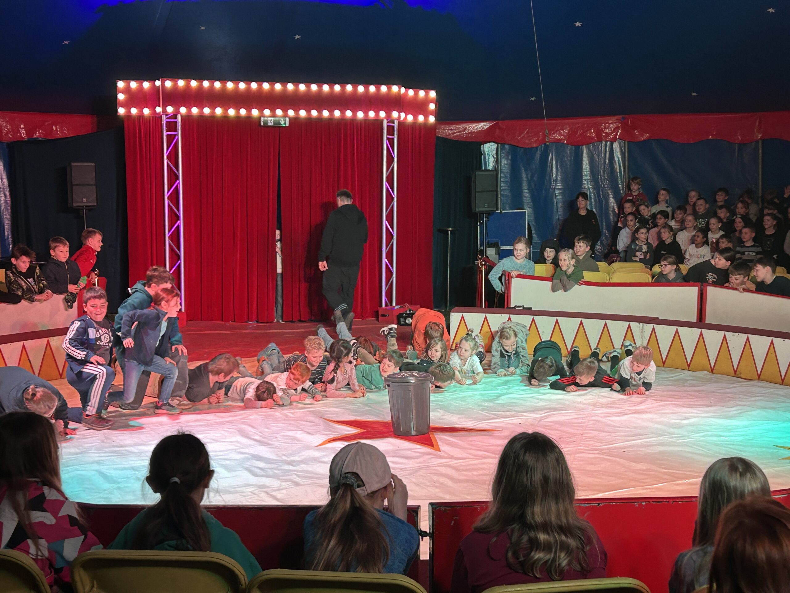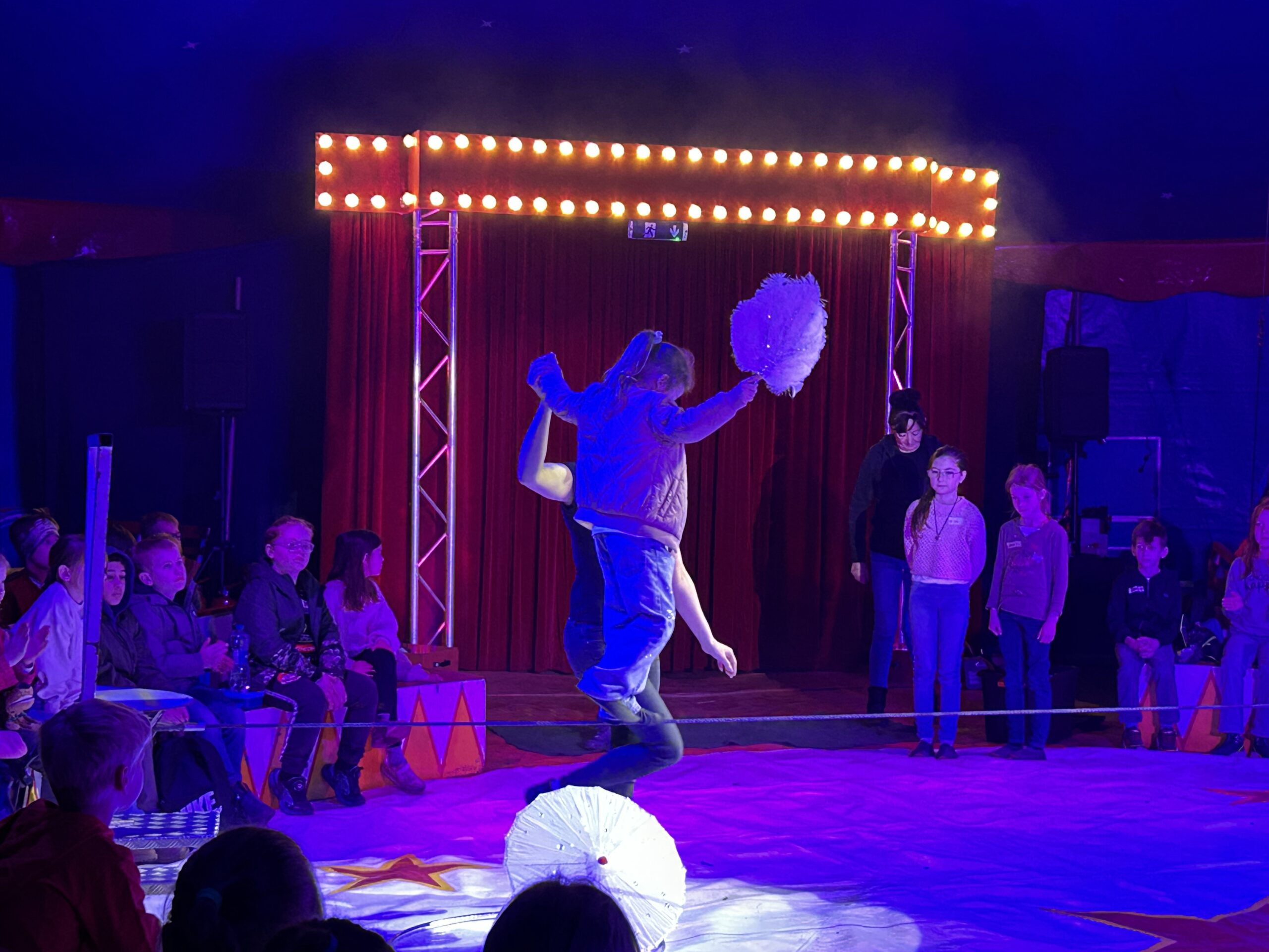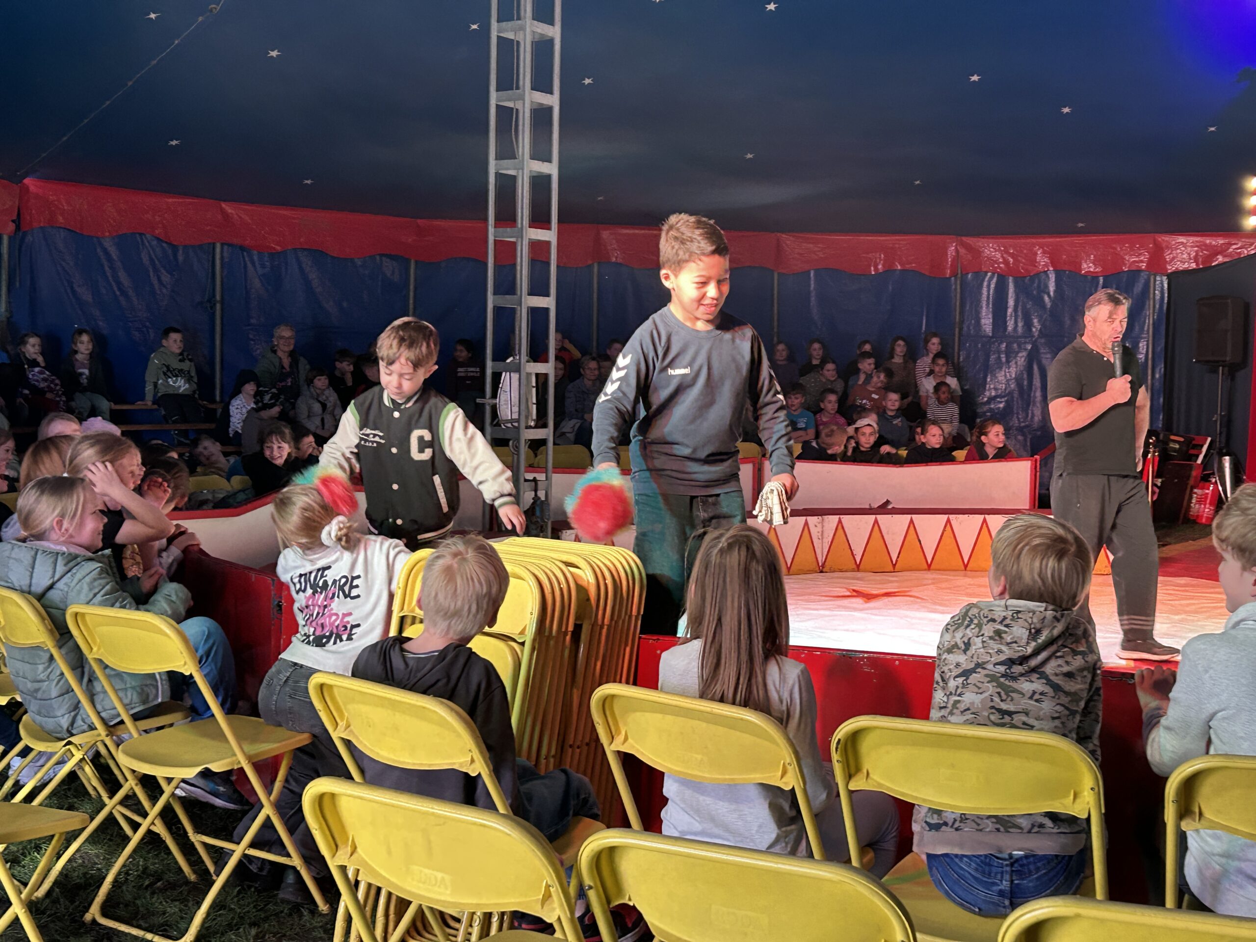 Am Montag sind wir mit allen Kindern der Grundschule und mit den Vorschulkindern aus den Kindertagesstätten in das Zirkuszelt gegangen. Dort begrüßte uns das Zirkusteam und stellte uns die Darbietungen vor. Bereits bei der Schnupperstunde konnten schon die ersten Kinder aktiv dabei sein.
