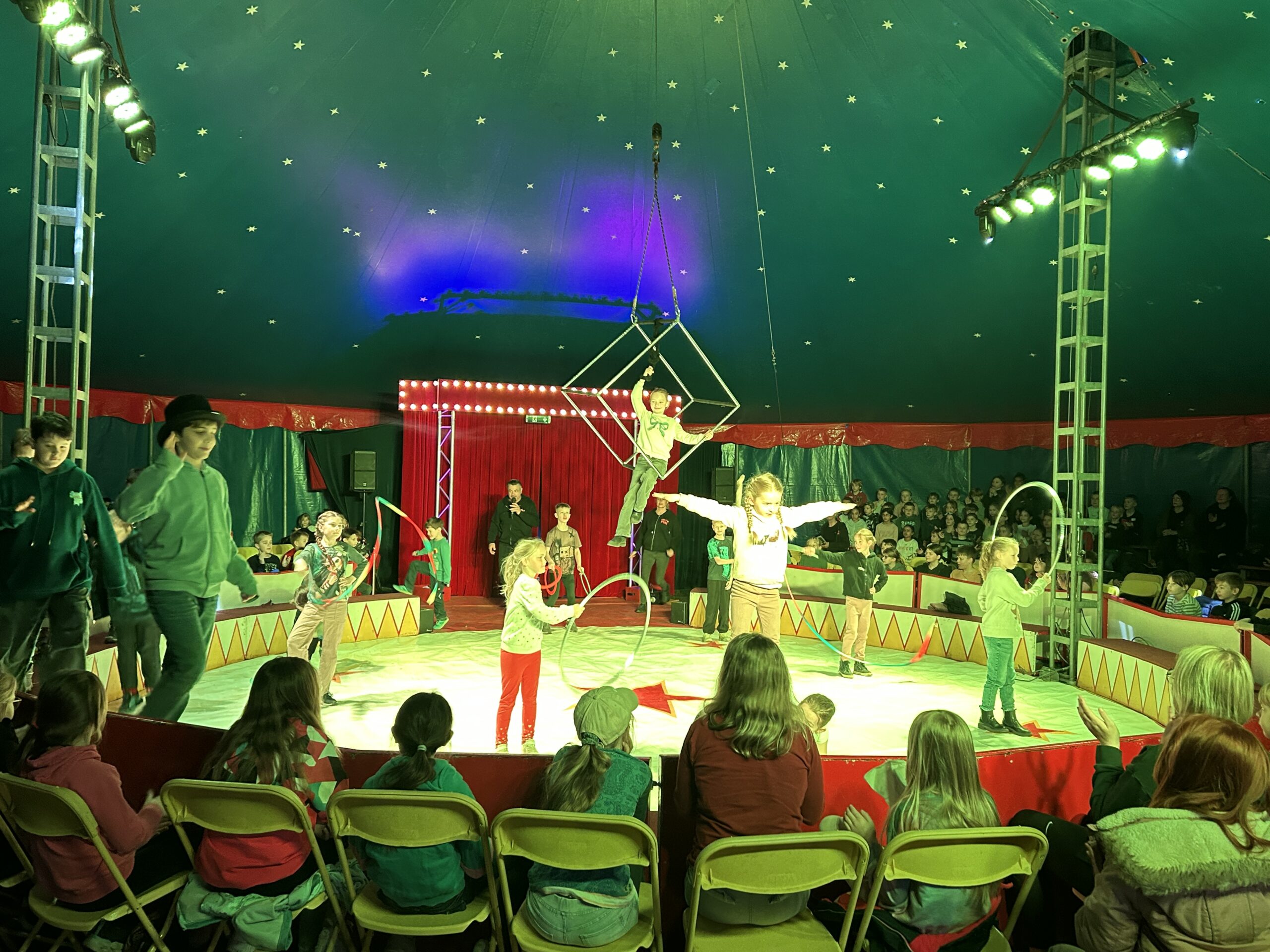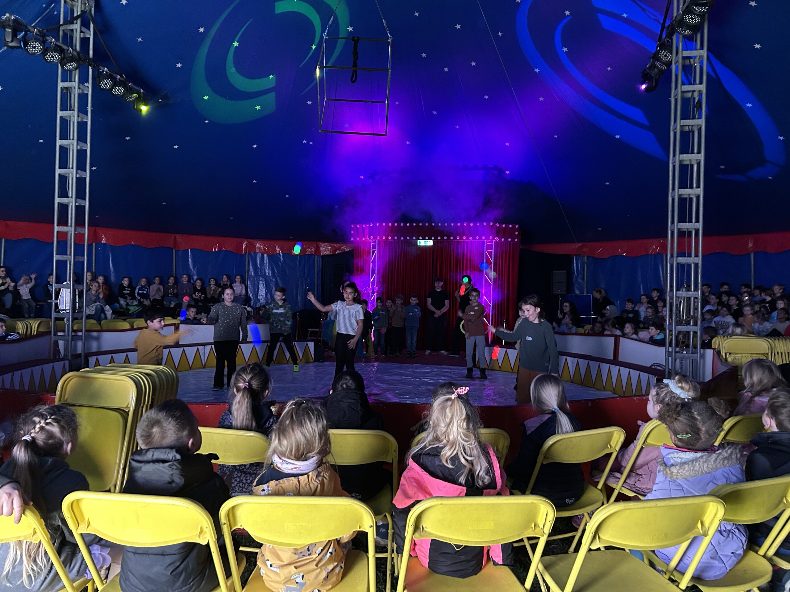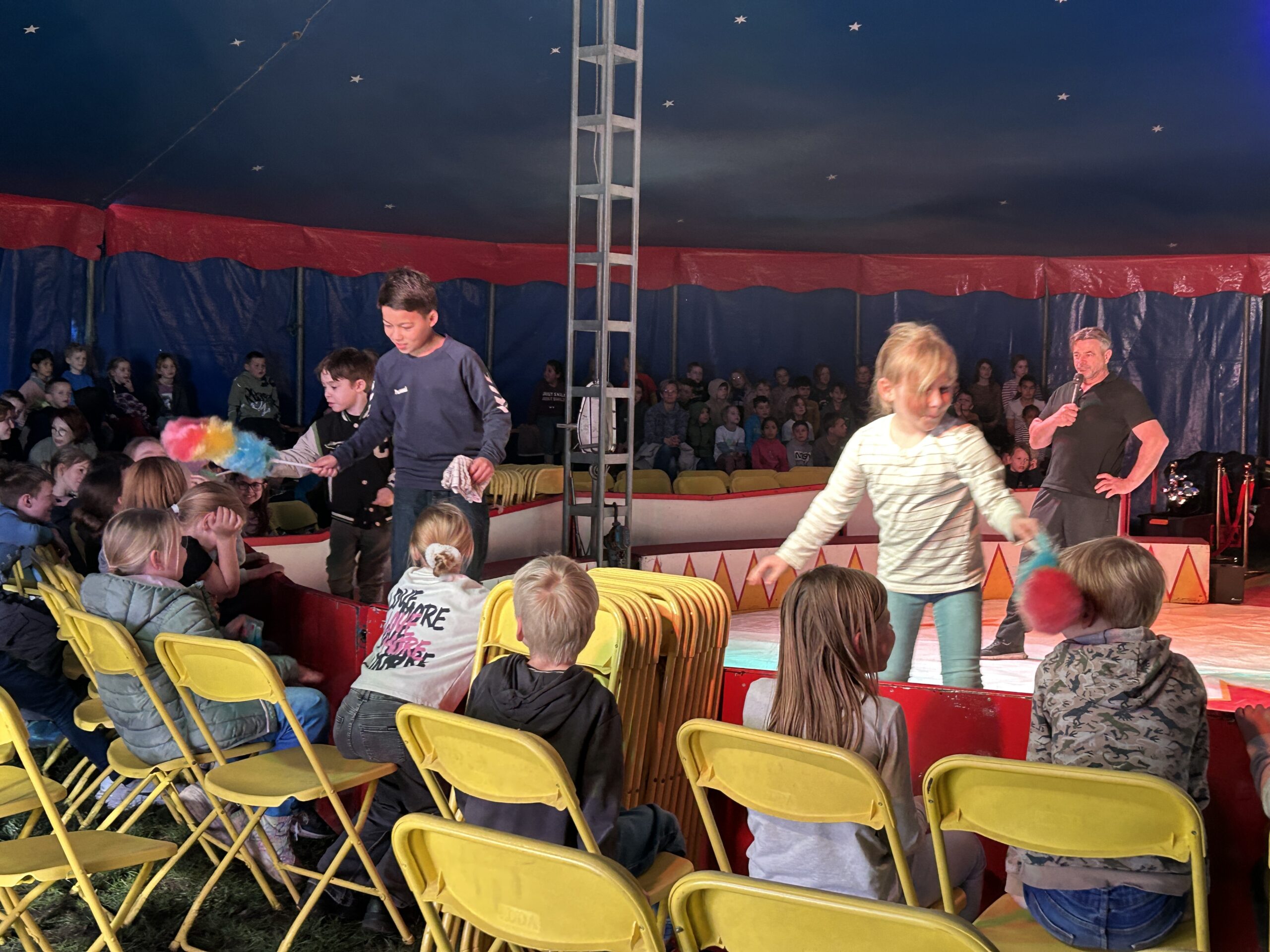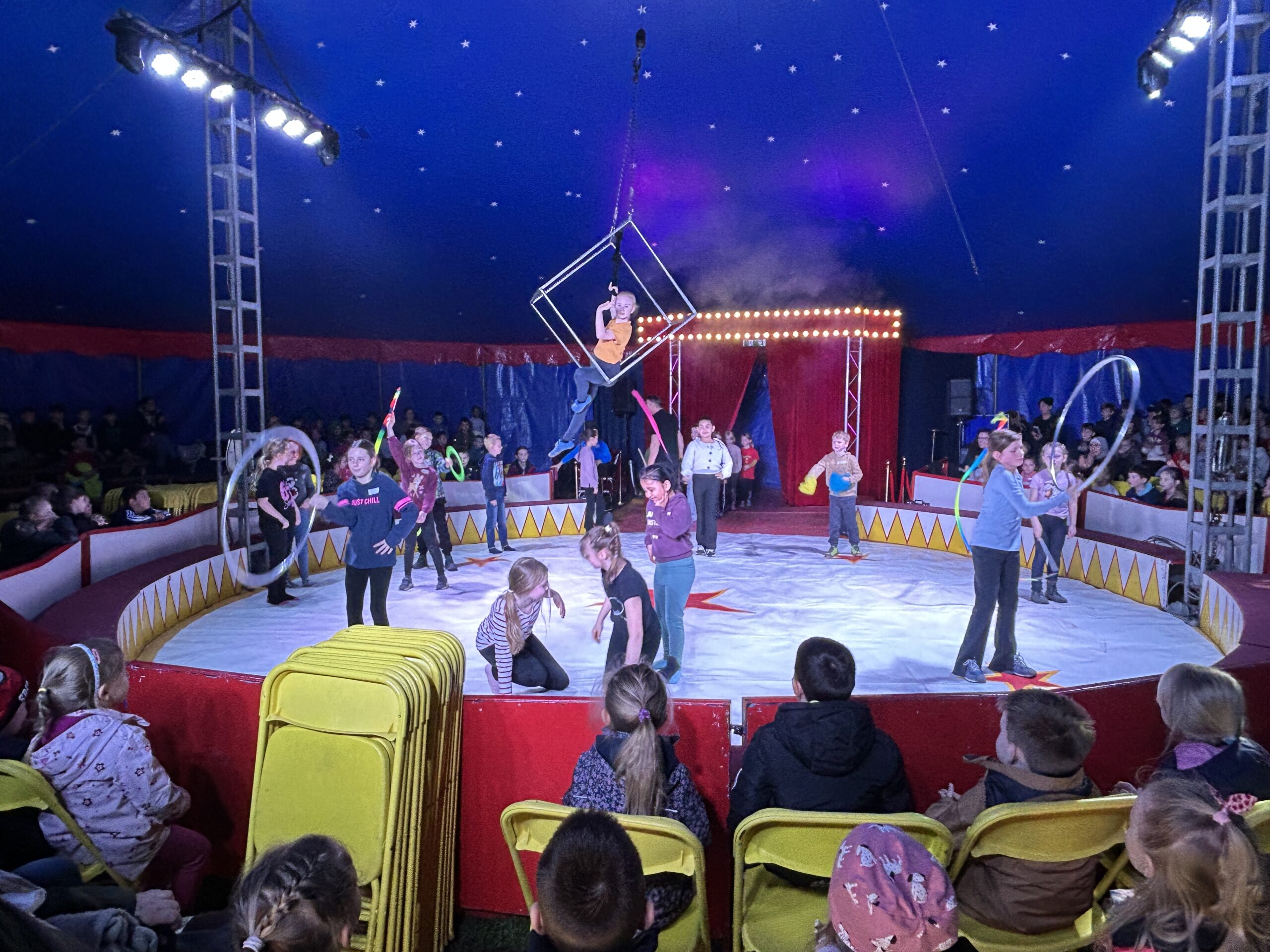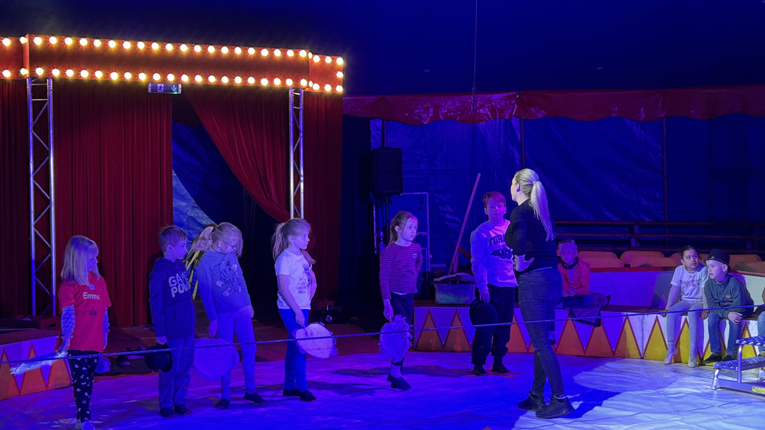 Am Montag sind wir mit allen Kindern der Grundschule und mit den Vorschulkindern aus den Kindertagesstätten in das Zirkuszelt gegangen. Dort begrüßte uns das Zirkusteam und stellte uns die Darbietungen vor. Bereits bei der Schnupperstunde konnten schon die ersten Kinder aktiv dabei sein.