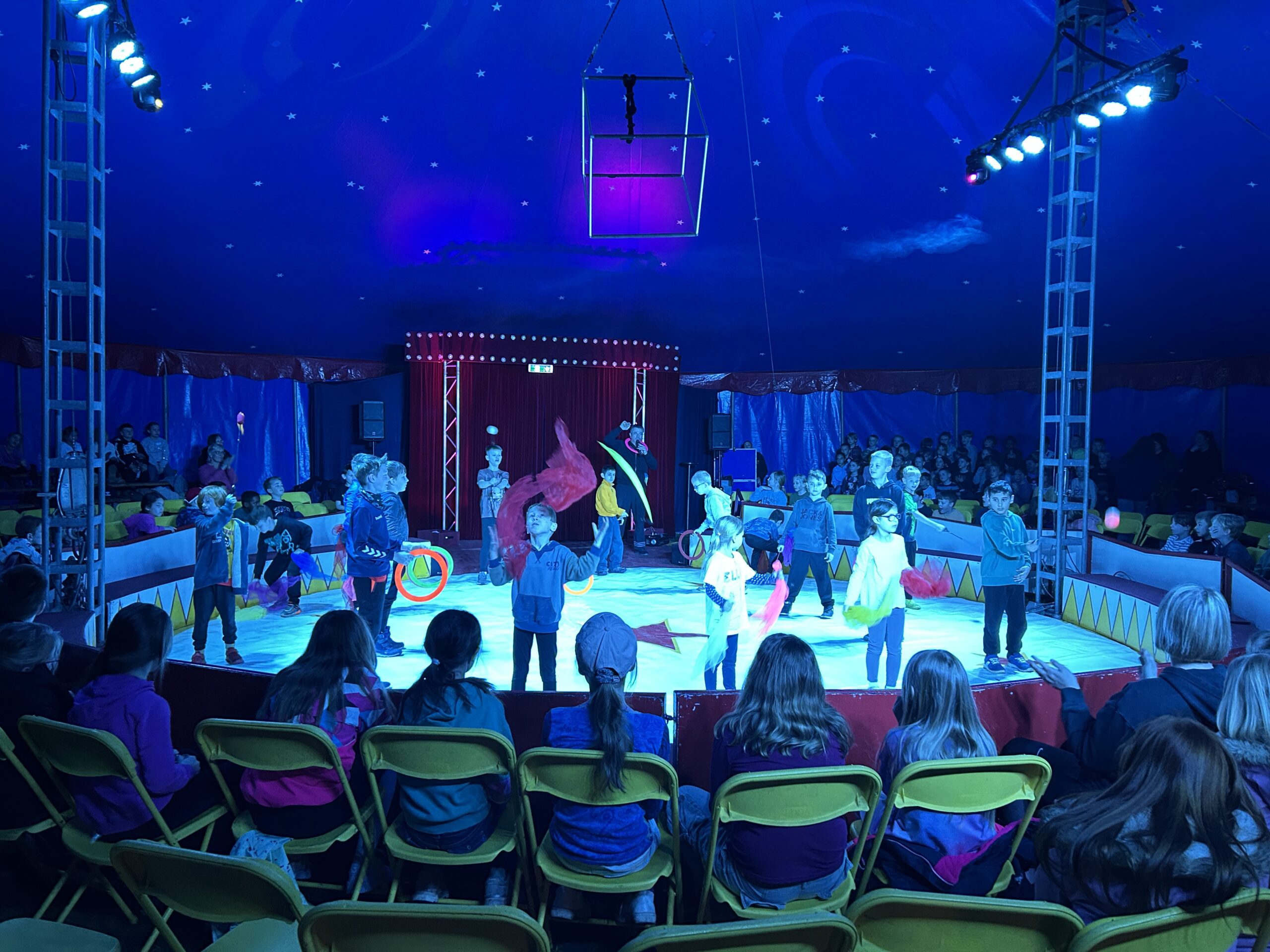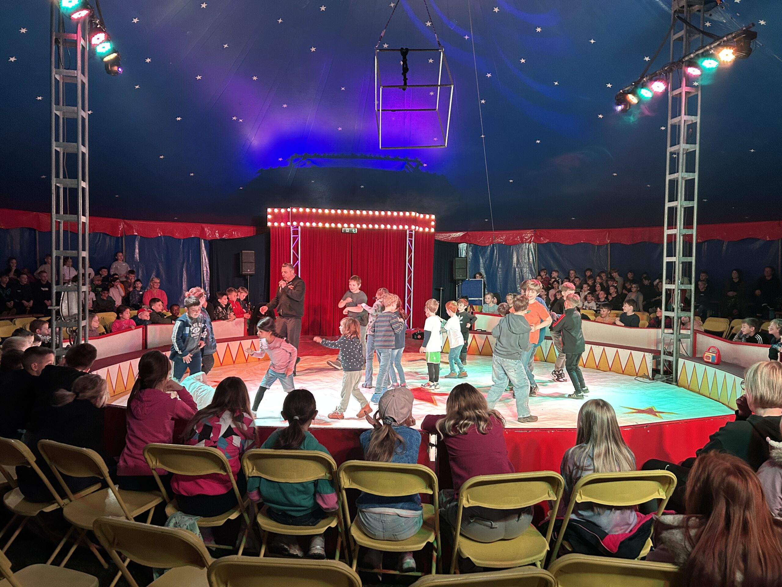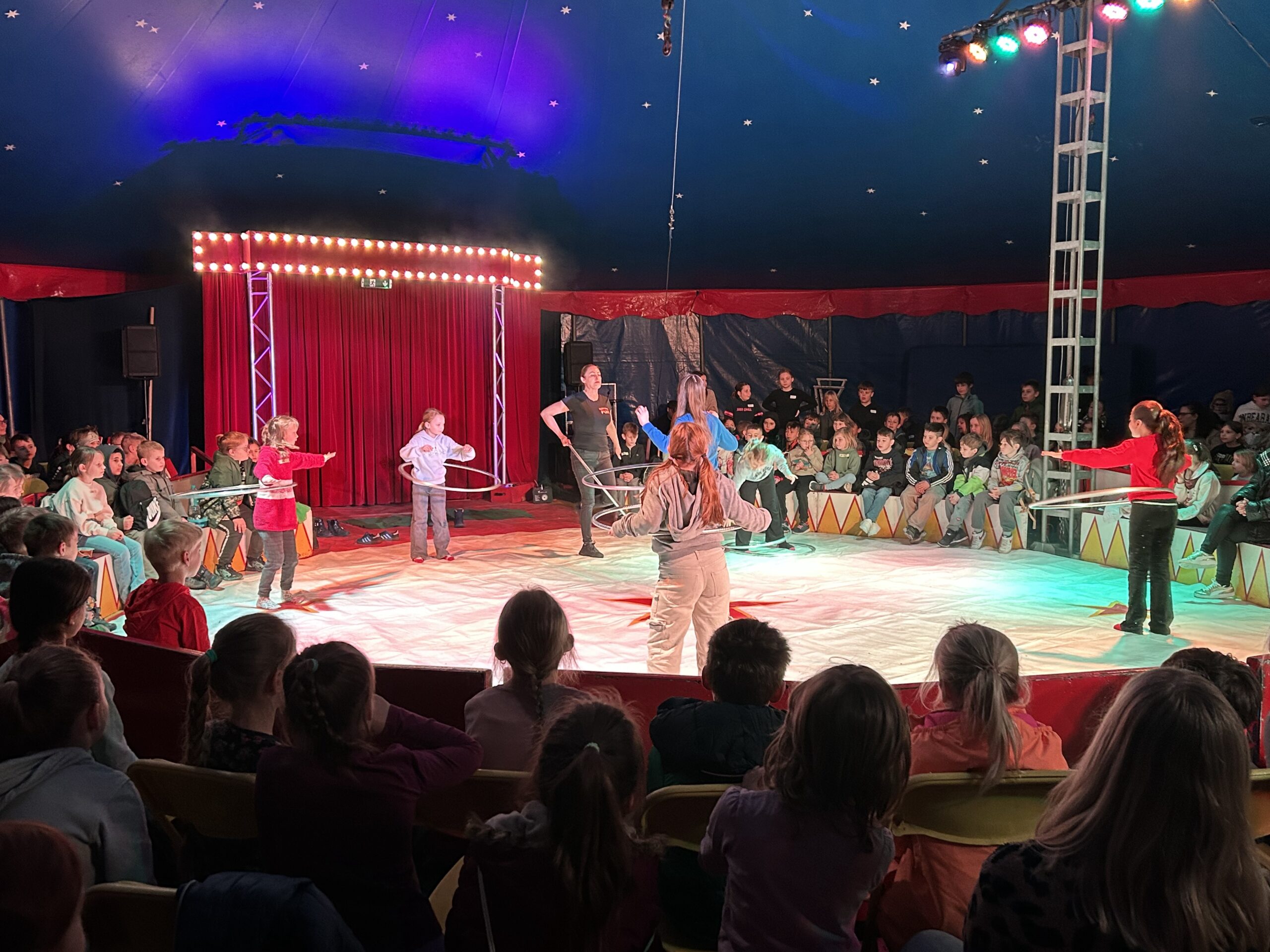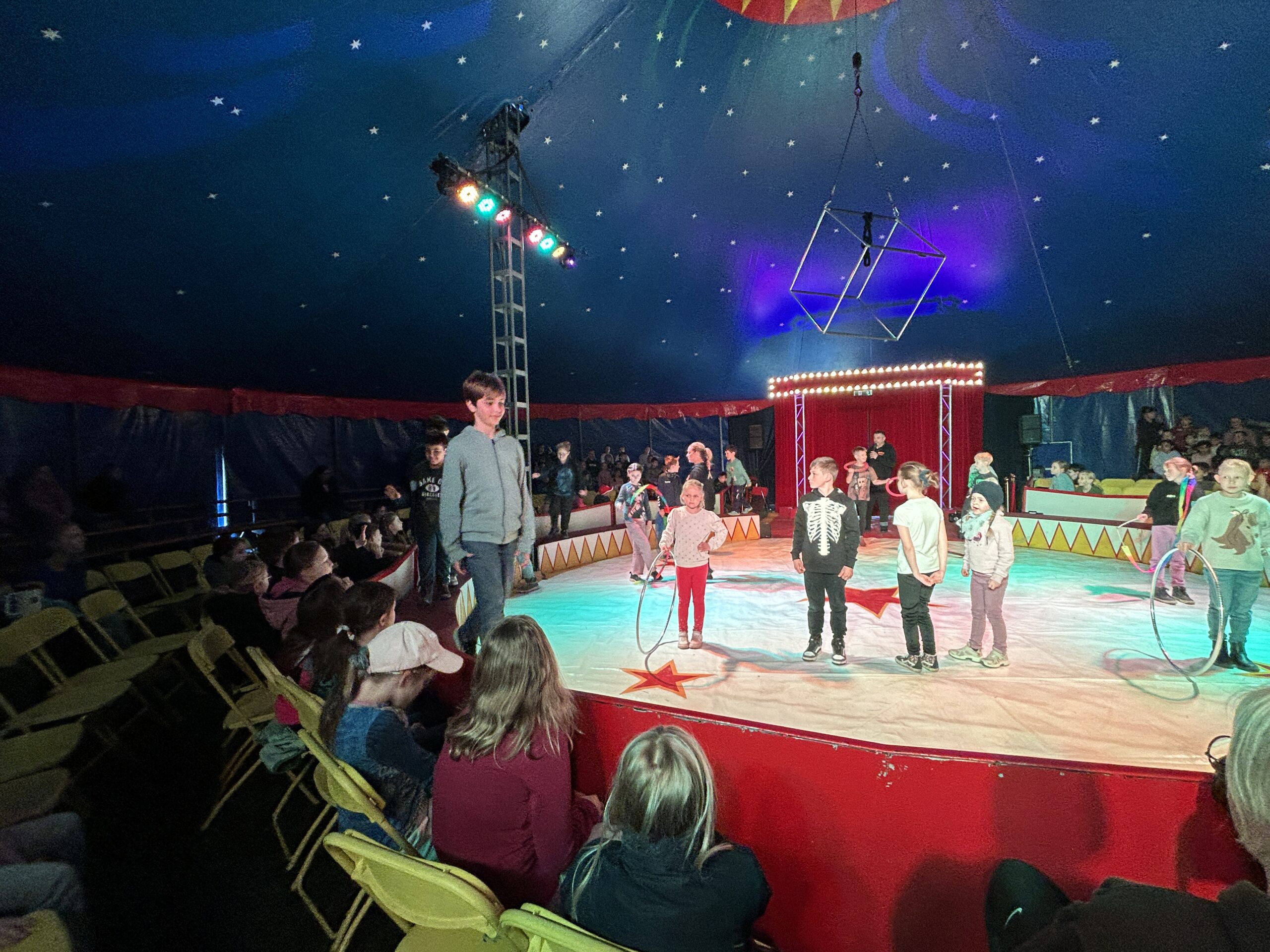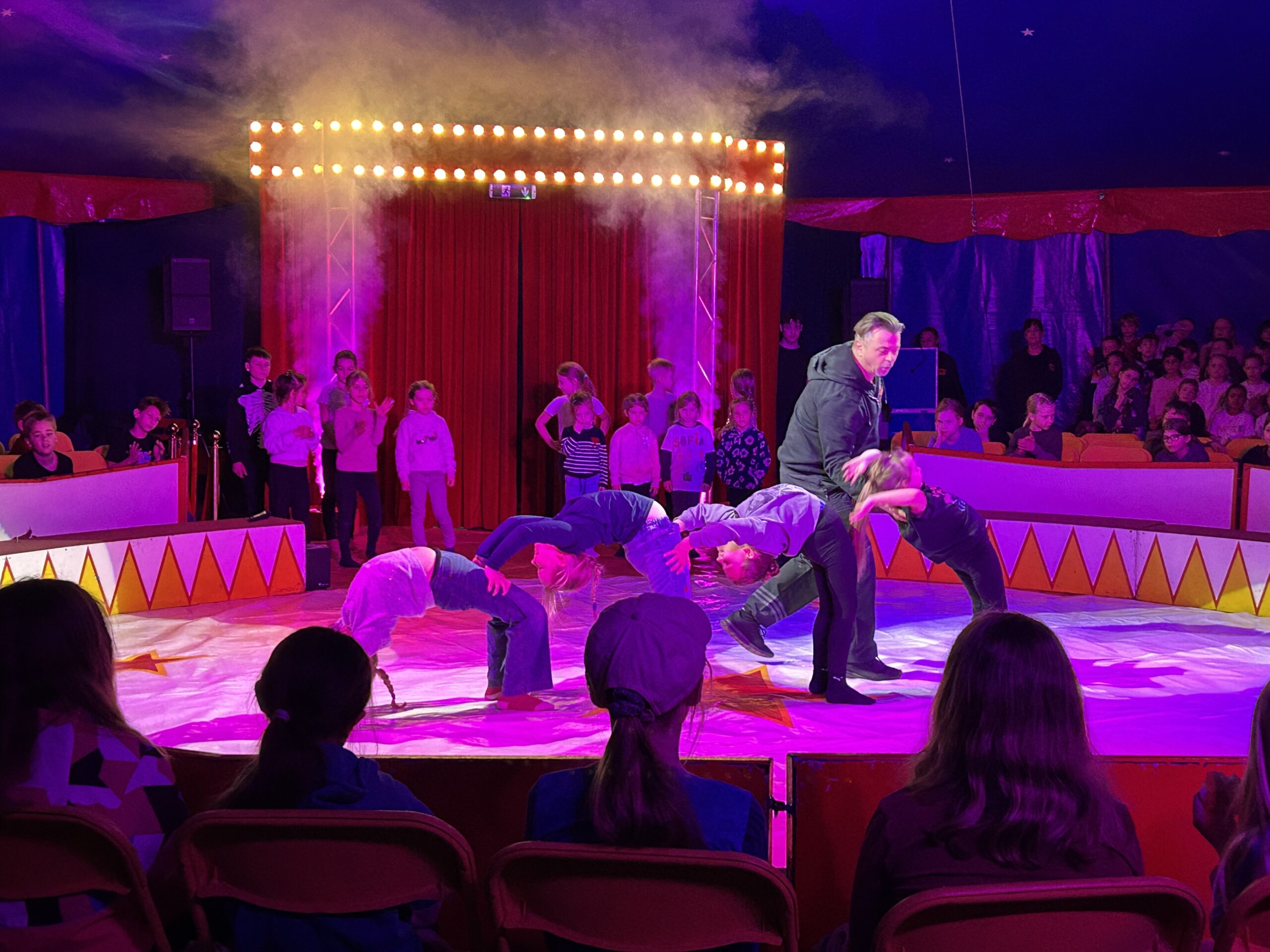 Am Montag sind wir mit allen Kindern der Grundschule und mit den Vorschulkindern aus den Kindertagesstätten in das Zirkuszelt gegangen. Dort begrüßte uns das Zirkusteam und stellte uns die Darbietungen vor. Bereits bei der Schnupperstunde konnten schon die ersten Kinder aktiv dabei sein.