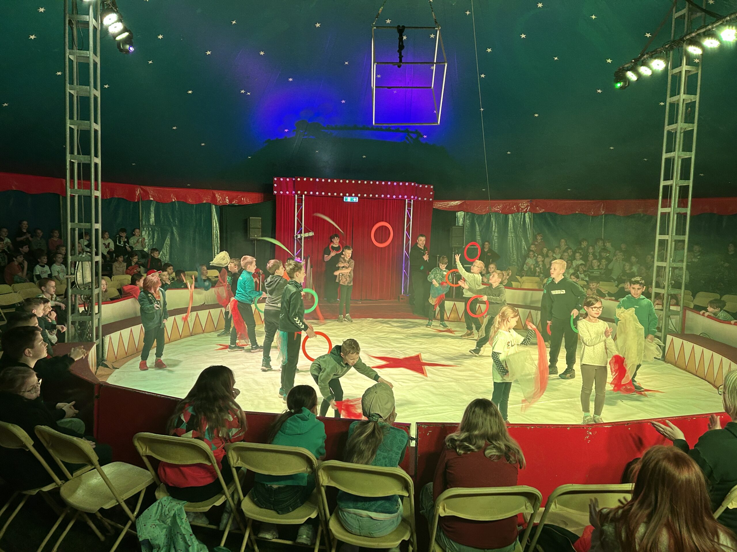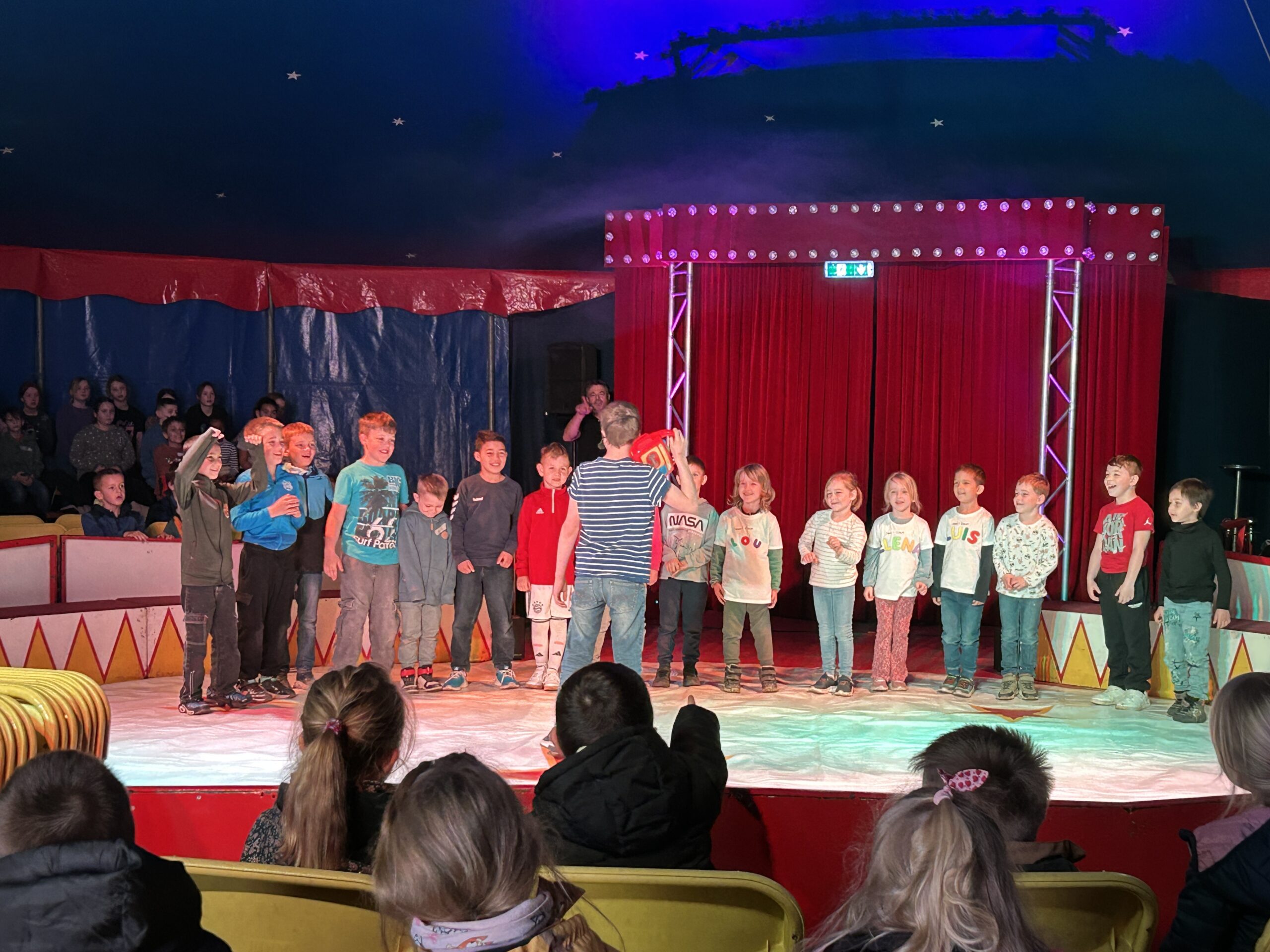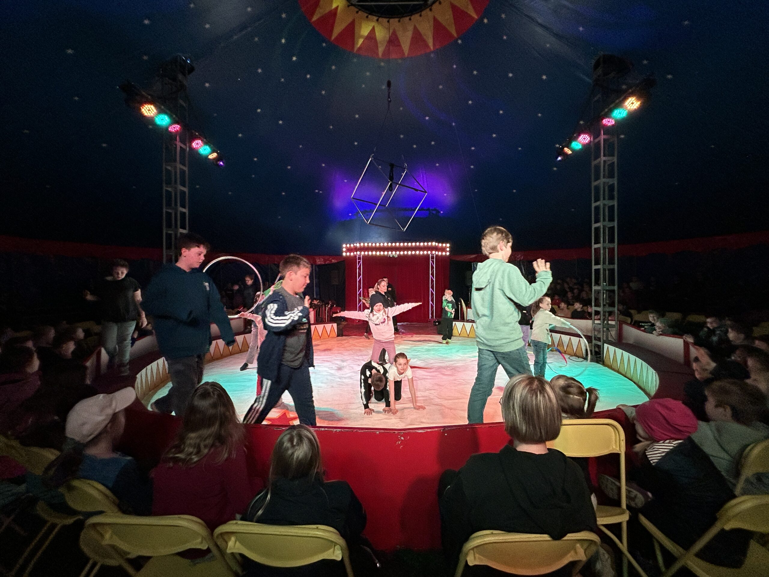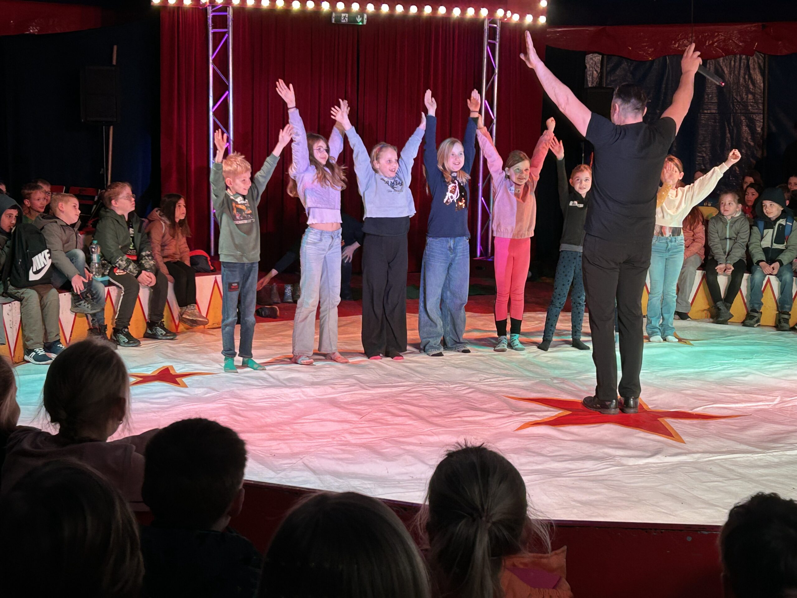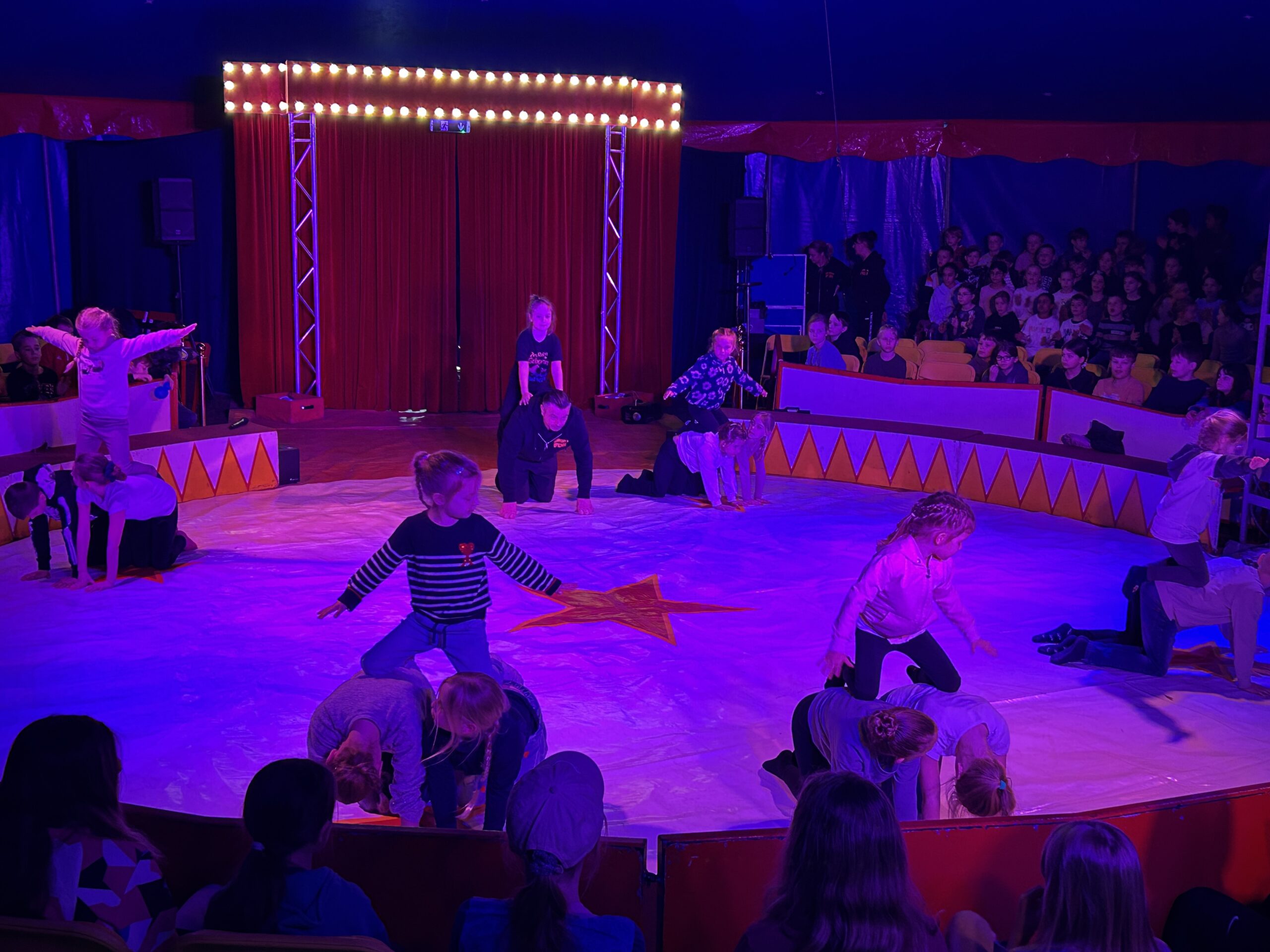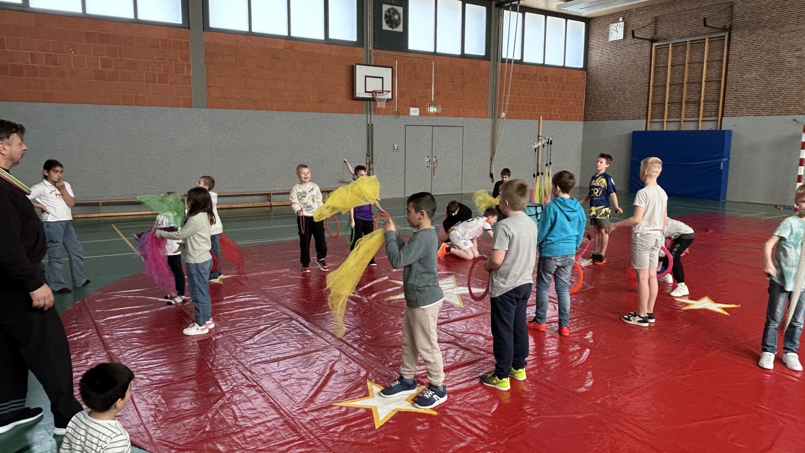 Am Montag sind wir mit allen Kindern der Grundschule und mit den Vorschulkindern aus den Kindertagesstätten in das Zirkuszelt gegangen. Dort begrüßte uns das Zirkusteam und stellte uns die Darbietungen vor. Bereits bei der Schnupperstunde konnten schon die ersten Kinder aktiv dabei sein.
