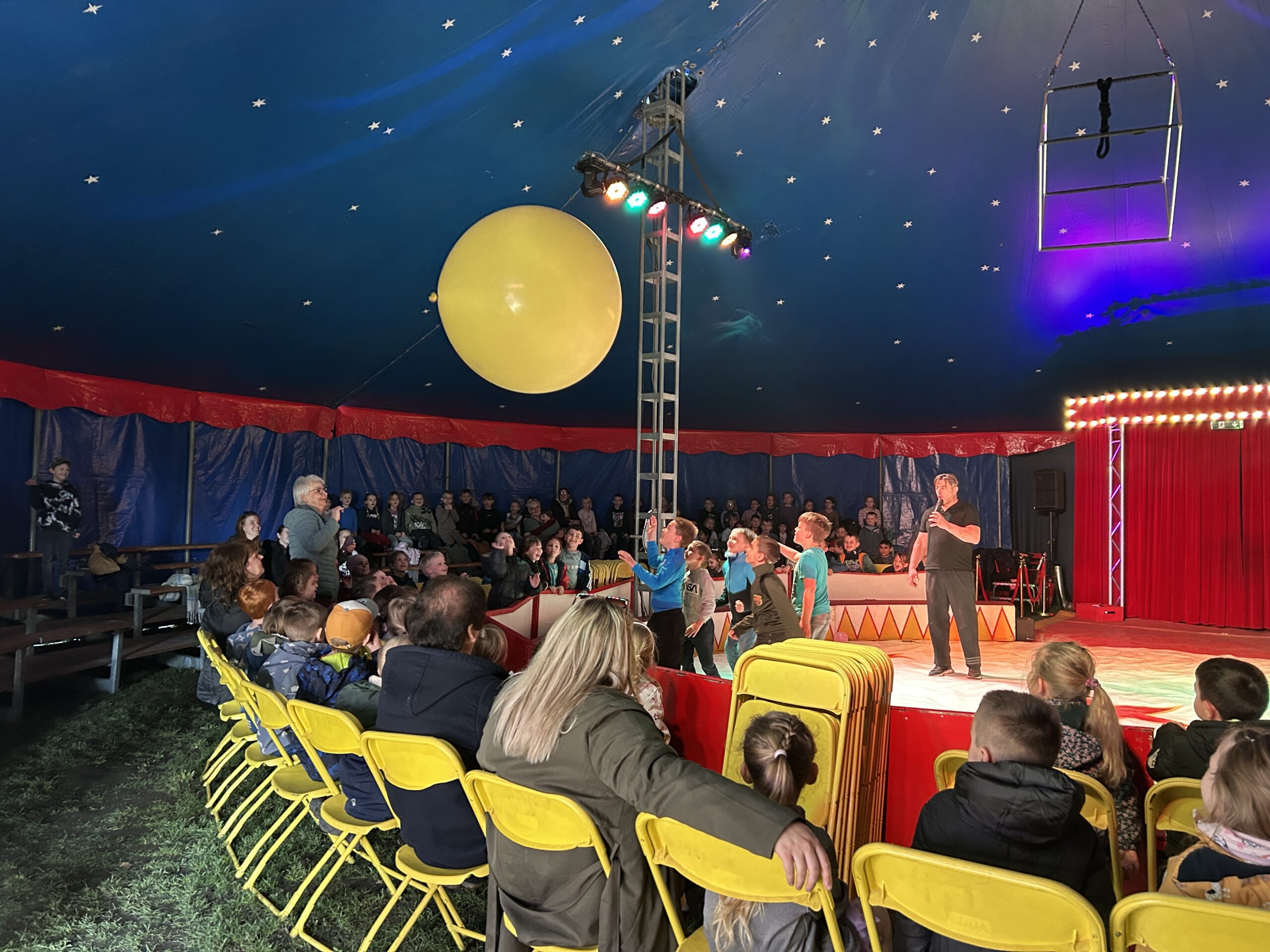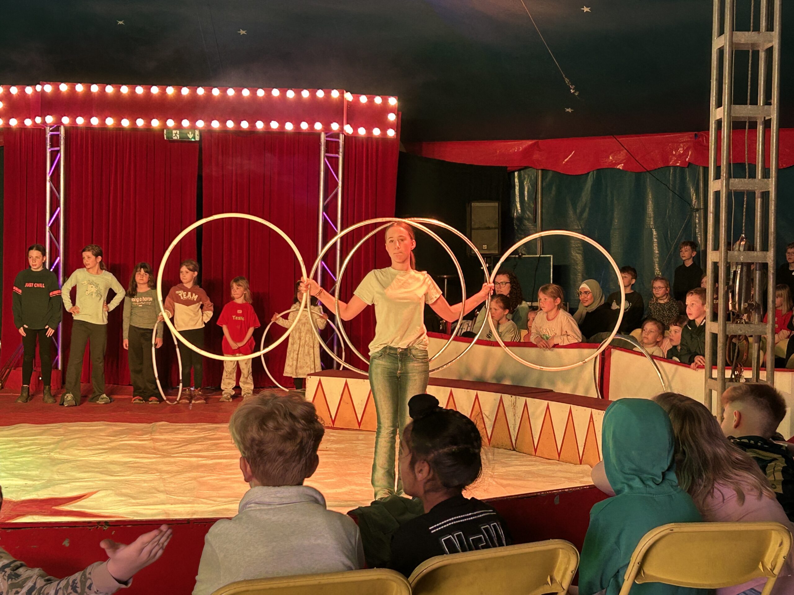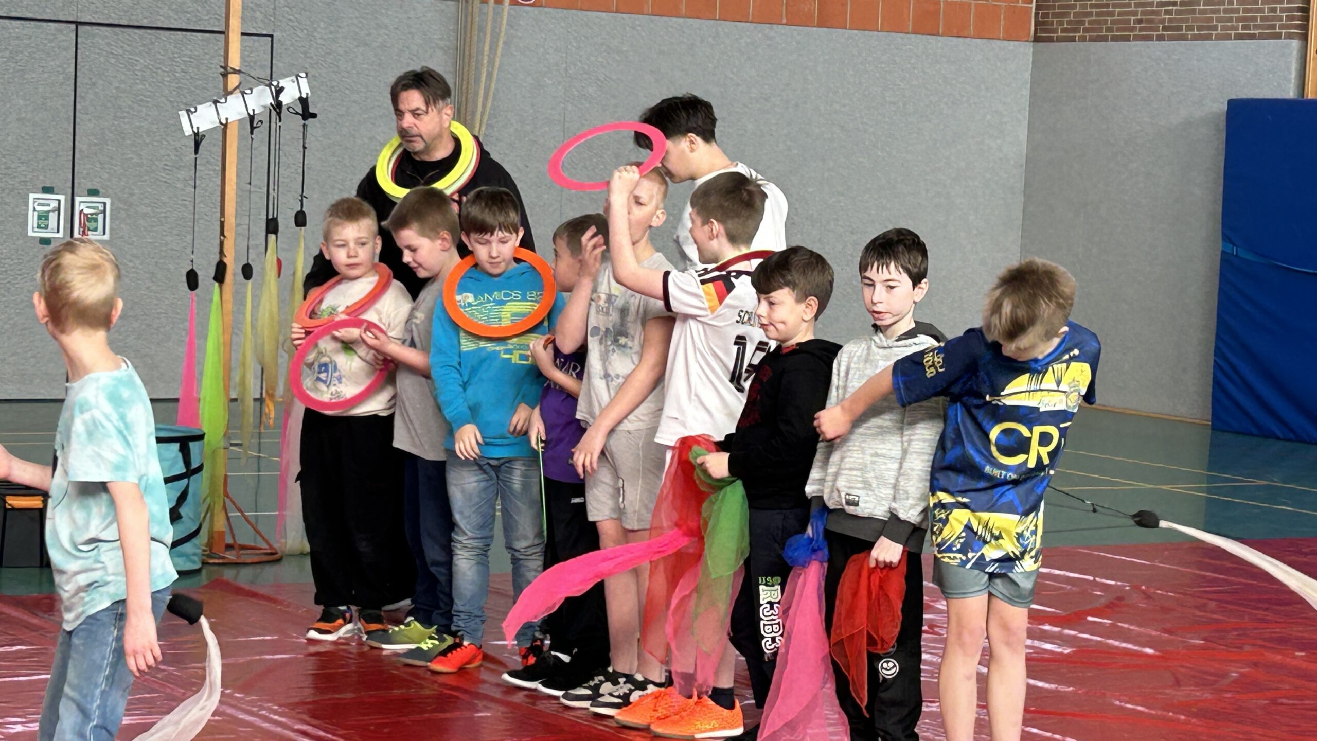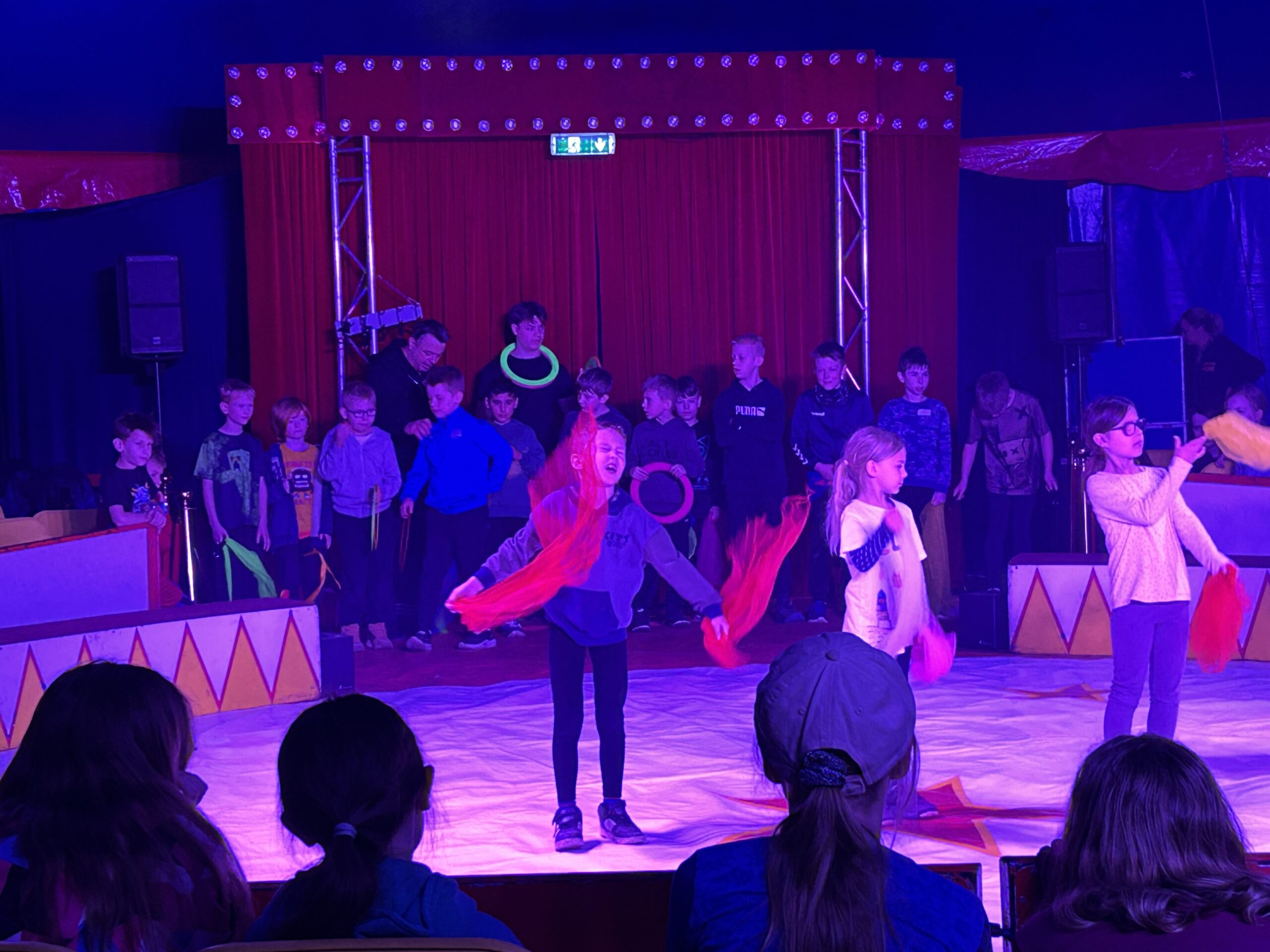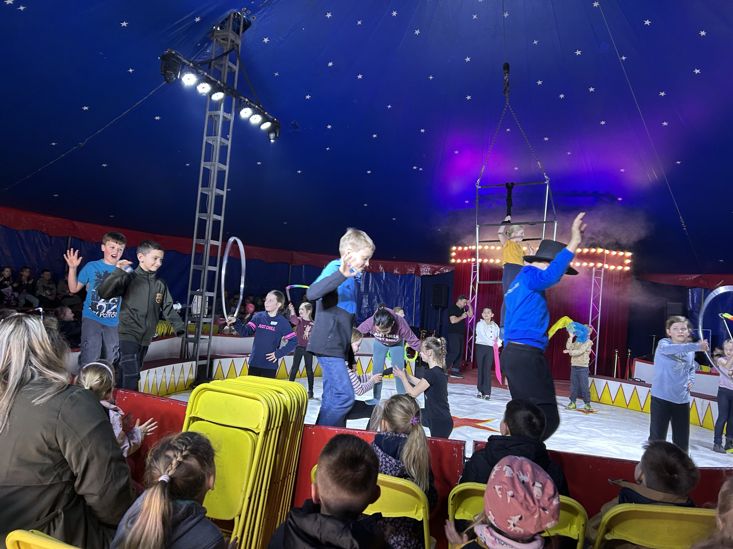 Am Montag sind wir mit allen Kindern der Grundschule und mit den Vorschulkindern aus den Kindertagesstätten in das Zirkuszelt gegangen. Dort begrüßte uns das Zirkusteam und stellte uns die Darbietungen vor. Bereits bei der Schnupperstunde konnten schon die ersten Kinder aktiv dabei sein.