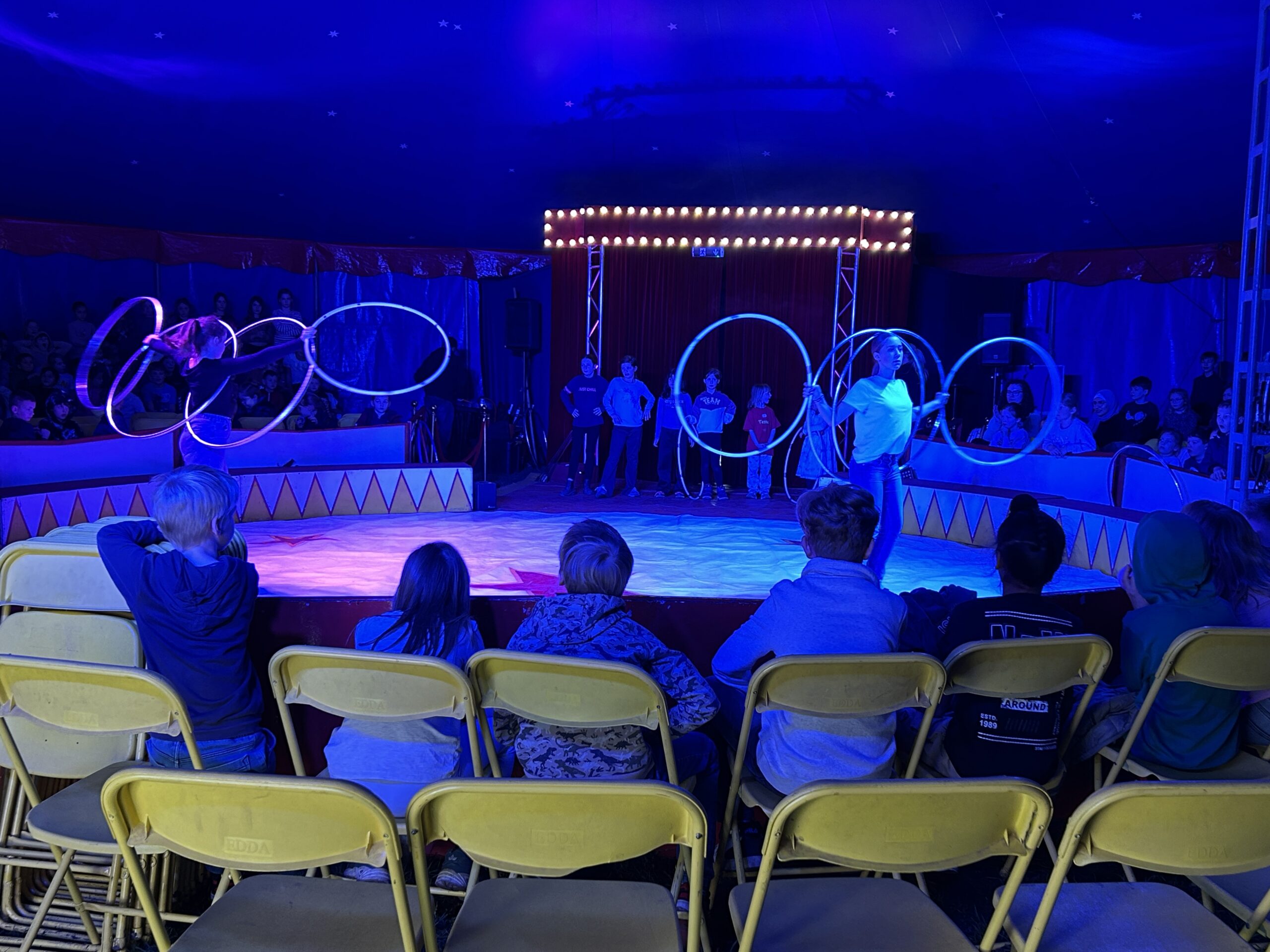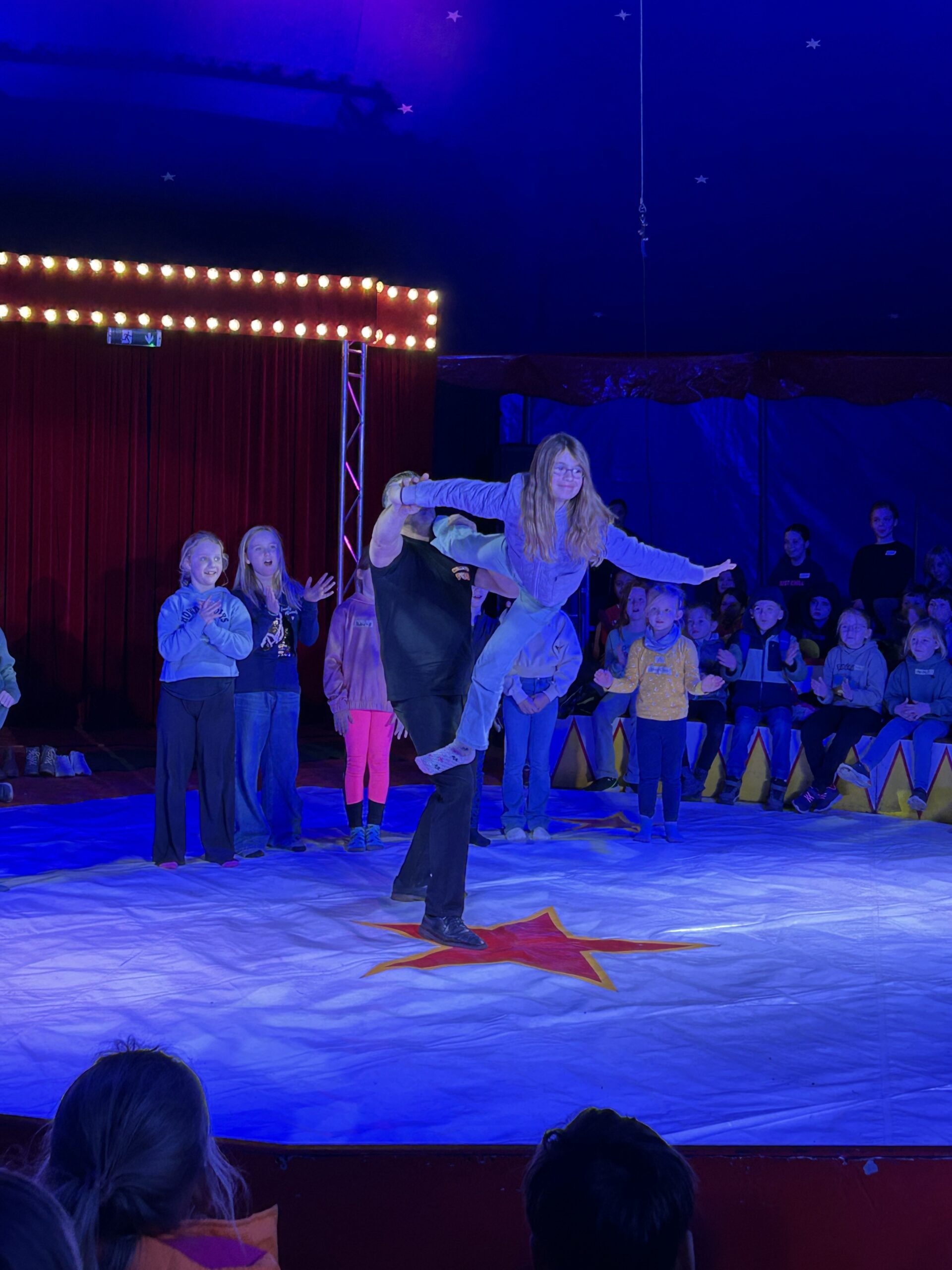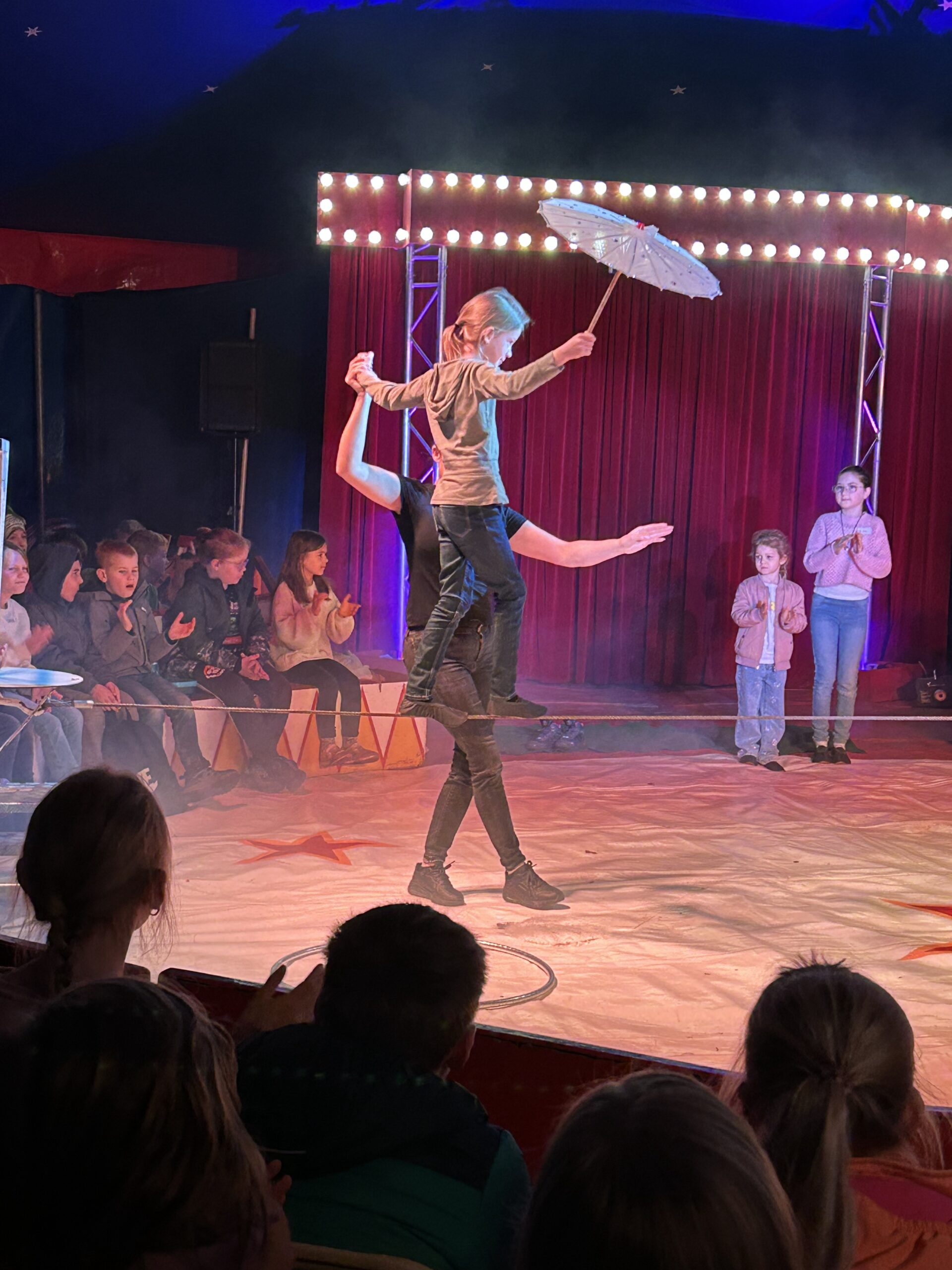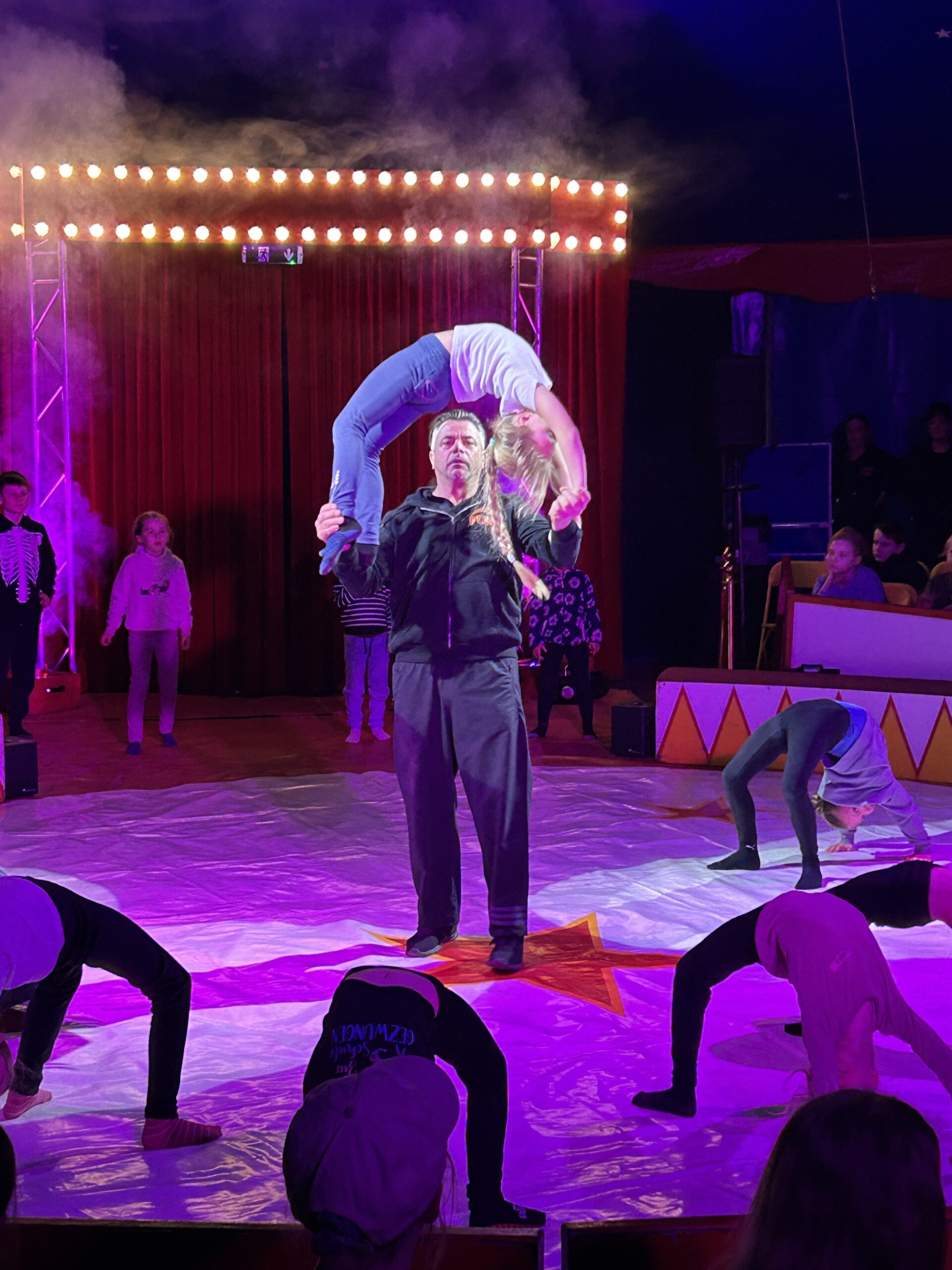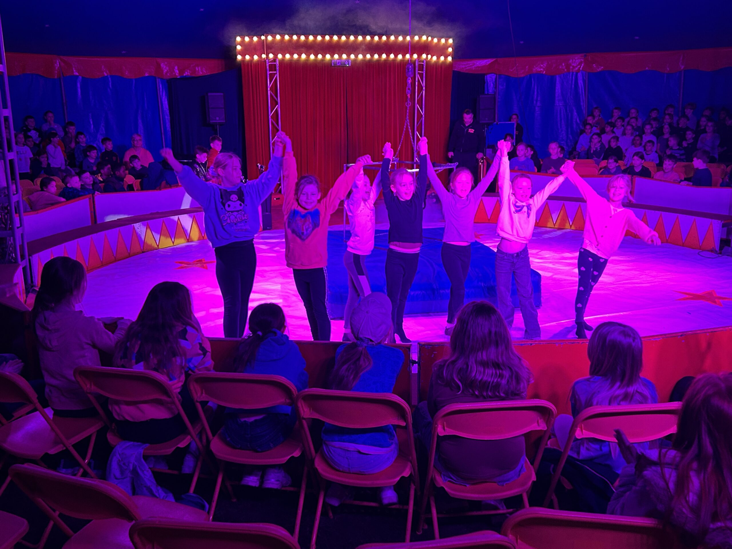 Am Montag sind wir mit allen Kindern der Grundschule und mit den Vorschulkindern aus den Kindertagesstätten in das Zirkuszelt gegangen. Dort begrüßte uns das Zirkusteam und stellte uns die Darbietungen vor. Bereits bei der Schnupperstunde konnten schon die ersten Kinder aktiv dabei sein.