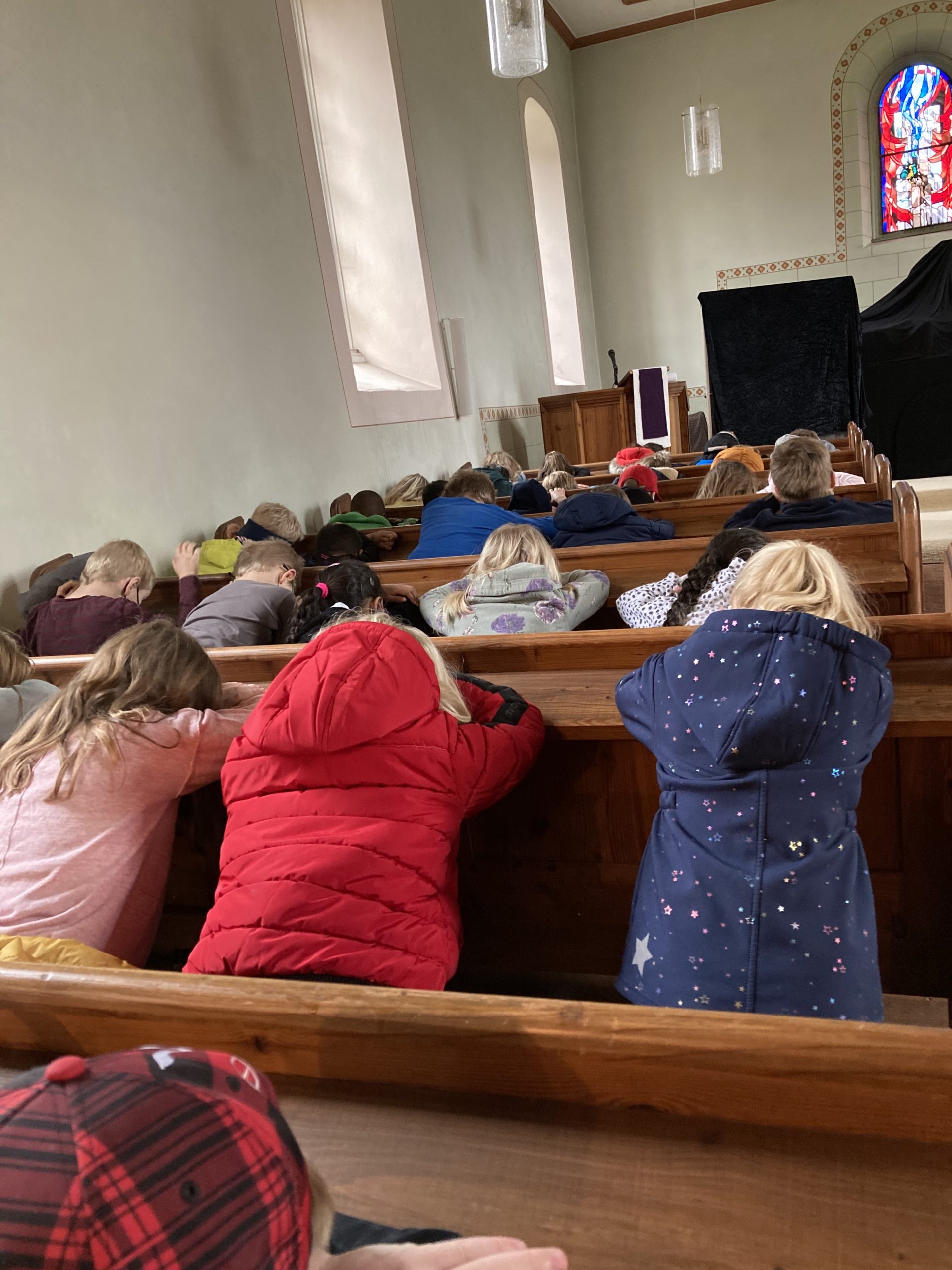 Nach einer kleinen Pause geht es weiter in die Kirche. Dort hat uns Suse Natho mit kräftiger Unterstützung empfangen. Am Anfang noch ganz verhüllt, kam mit der Zeit Farbe in die Geschichte und die Kinder haben die Chance ihre Stimme zu nutzen. Was ist dir wichtig an Ostern? Was wünschst Du dir? Geborgenheit, Wärme oder neues Leben? Nachdem jedes Kind sich in dem Zuge eine Narzisse abgeholt hat, sind wir gemeinsam nach draußen gegangen und haben den Jesus-Fisch als Symbol des Friedens aufgestellt.